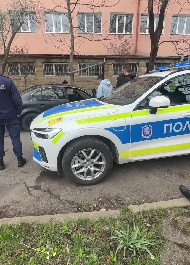 parked police car with its lights flashing on the side of a street. A dark gray sedan is parked in front of it. Three people are standing between the cars. The police car is white, with blue and yellow stripes and lettering that reads "ПОЛИЦИЯ" in Cyrillic. The car has a crest on the door. A person wearing a blue uniform with the words "SECURITY POLICE" on the back is standing to the left of the car facing away from the camera. The environment appears to be an urban setting with a multi-story building in the background. There are trees and some grass visible. The weather appears overcast.