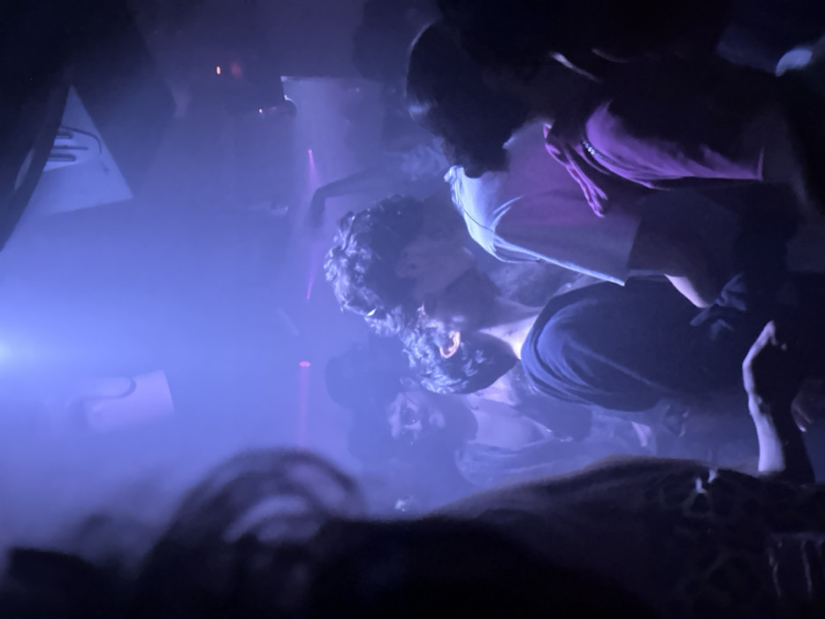 A crowded indoor scene bathed in blue lighting and haze. Several people are visible, appearing to be in a close or concert setting. A person wearing a white shirt with a purple collar is near the front. Others are wearing black shirts or jackets. Some have their arms raised. Stage lighting equipment is visible in the top left of the image.