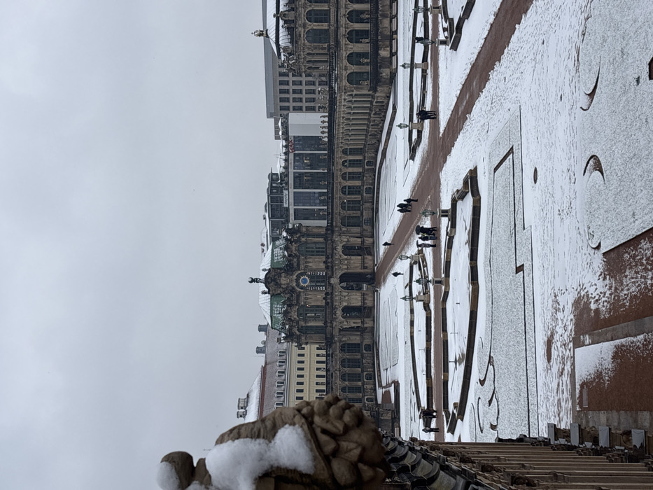 The image depicts an elevated view of the Zwinger Palace in Dresden, Germany, under overcast winter conditions with a light dusting of snow