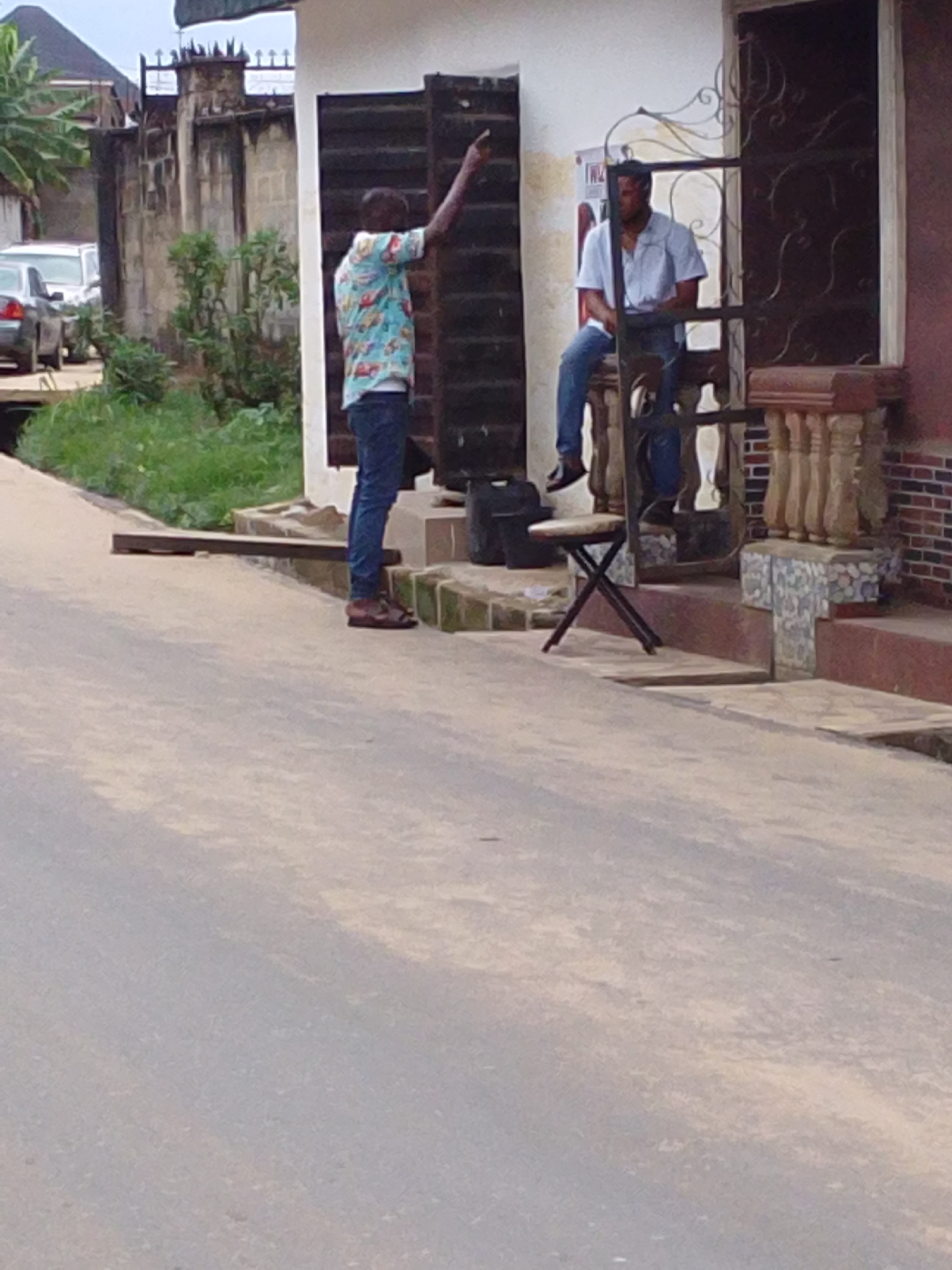 two men outside a building in Aba, Nigeria. One man stands, wearing a patterned short-sleeved shirt and jeans, with his arm raised and hand pointing upward. The other man sits on a wrought iron structure resembling a gate or fence. He is wearing a light-colored short-sleeved shirt and jeans. A black folding stool is placed on the steps leading up to the building. The background includes a street, a car, and buildings with high fences. The road surface appears worn. Vegetation is present on the side of the road and around the building.