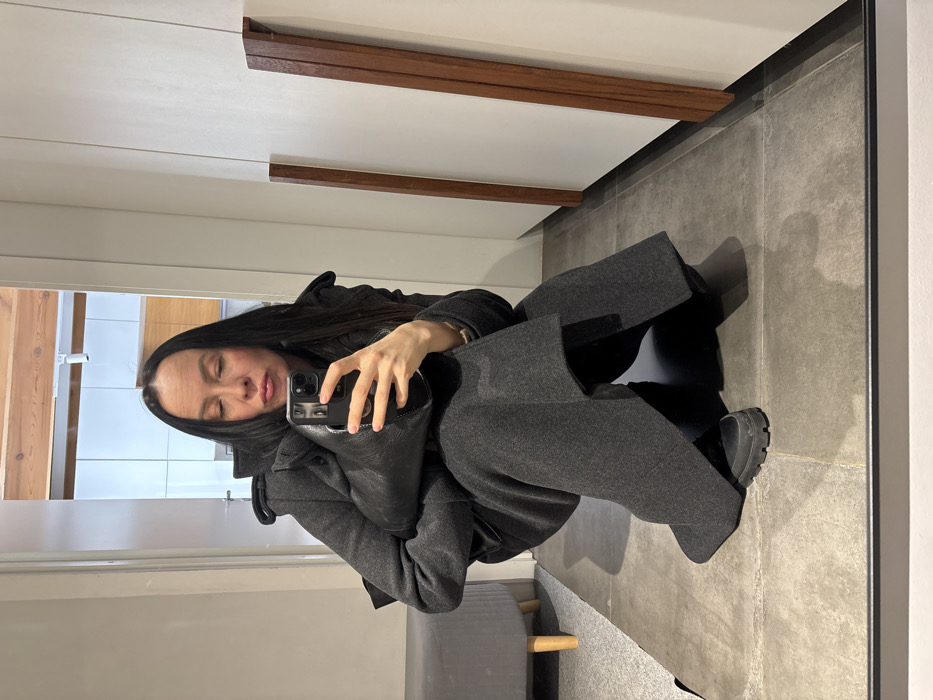 A female individual is depicted in a mirror selfie, squatting on a gray tiled floor within an indoor setting in Chaikovsky, Russia. She possesses long dark hair, with her eyes closed and lips slightly pursed. She is dressed in a dark gray wool-blend duffle coat with visible hood and shoulder details, paired with matching dark gray wide-leg trousers and black chunky-soled boots. Her right hand holds a black smartphone, positioned to capture the reflection. Her left arm supports a large black, textured clutch bag against her torso. The immediate environment includes the gray tiled floor and white walls. To the left in the reflection, a segment of a gray upholstered stool with light wooden legs is visible. To the right, two vertical wooden strips are mounted on a white wall, possibly indicating a wardrobe or decorative paneling. Through an open doorway in the background reflection, a modern interior space is discernible, featuring light-colored cabinetry, a wooden ceiling beam, and overhead lighting fixtures.