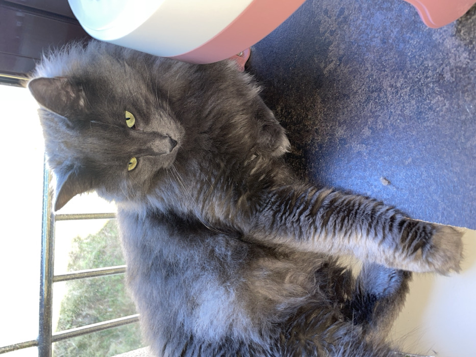 - "A long-haired, gray domestic cat is depicted lying on a dark, textured surface, likely a countertop or windowsill, indoors in Boreti, Montenegro" by FM-GgSpJ3, licensed under CC BY 4.0
