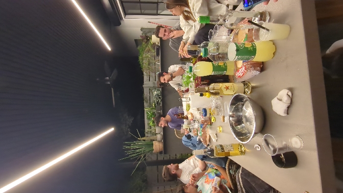 The image depicts an evening gathering of seven young adults on a residential outdoor patio in Modiin-Maccabim-Reut, Israel. The setting is illuminated by two linear LED light fixtures on a dark, corrugated ceiling, which also features a ceiling fan. The background includes potted plants on a low wall, a slatted wooden fence, and dark foliage, indicating an outdoor environment at night. Six males and one female are seated around a rectangular gray table, engaged in conversation and consumption of beverages. From left to right, a male in a tie-dye shirt is partially visible, followed by a male in a light t-shirt leaning back. Next, a male in a purple shirt looks right, opposite a male with a beard leaning on his arm. A fifth male in a dark t-shirt holds a lit cigarette to his mouth, exhaling. To his right, a female with long hair gestures with her hands while speaking. A seventh person is partially visible at the bottom right, obscured by the table. The table is laden with multiple glass bottles of spirits, plastic bottles of mixers (including lemonade), plastic cups containing liquids (some with straws), and a black cylindrical ashtray with cigarette butts. A silver metallic bowl, a plastic container with snacks, a roll of paper towels, a white folded cloth, various small bottles, and bottle corks are also present. A mobile phone with an illuminated screen is visible on the far right, partially held by an unseen person. The individuals are dressed casually.