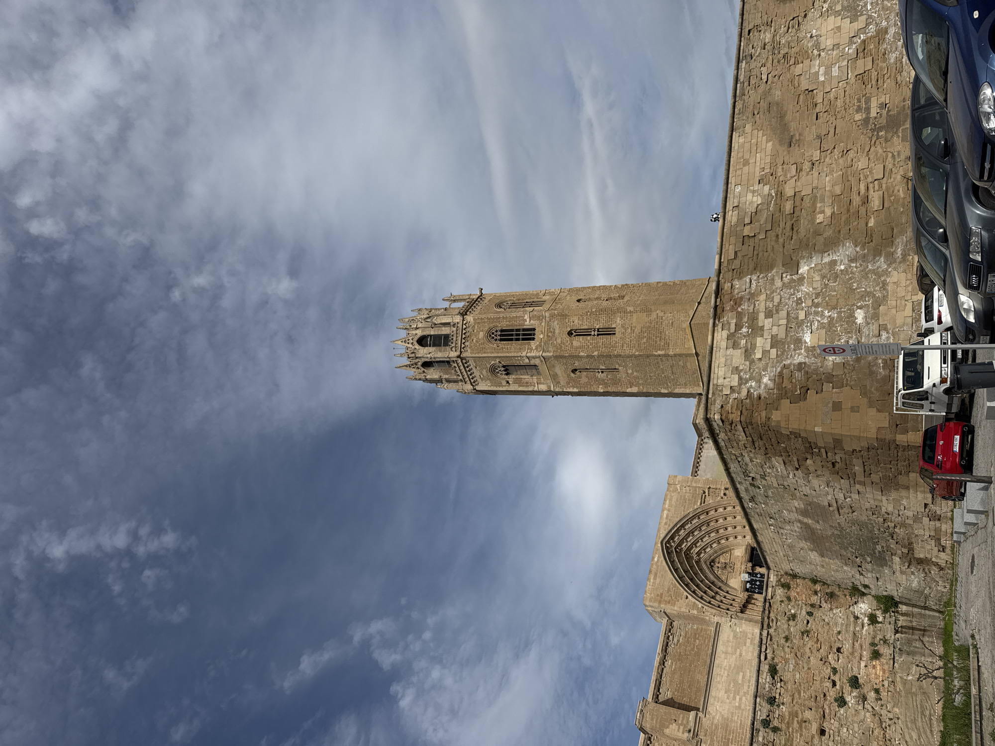 This image depicts the Seu Vella (Old Cathedral) and its bell tower in Lleida, Spain, viewed from a street-level parking area. The prominent central feature is the tall, slender, light brown stone bell tower, characterized by multiple tiers of Gothic-arched windows and a decorative, crenellated spire top. To the left of the bell tower, a section of the cathedral's main structure is visible, featuring a large, ornate arched portal with multiple receding arches. These structures rest upon a substantial, weathered stone retaining wall, approximately three stories high, exhibiting variations in stone color and white discoloration from exposure. At the base of this wall, in the foreground, a paved parking area is visible, containing several vehicles. From left to right, a white commercial van is partially visible, followed by a red hatchback car (license plate 2083 KNT), a dark gray sedan (Audi), and a partial view of a blue car. Beyond these, other vehicles are also parked. A red circular no-parking sign is affixed to a pole near the parking area, and gray stone bollards line the edge of the paved surface. Patches of green vegetation are present along the base of the stone wall. The sky is partially cloudy, with a mix of blue sky and scattered white and gray stratocumulus clouds. One small human figure is discernible standing atop the stone wall to the right of the bell tower, wearing dark clothing. Two additional, smaller figures are visible near the ornate arched entrance on the cathedral's facade. The scene suggests a daytime setting with ambient lighting.