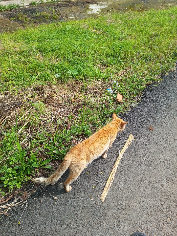 An orange cat walks along a paved asphalt road bordering a patch of green grass and plants. The cat, captured from above, is moving away from the viewer. A long piece of stripped bark or wood lies on the pavement near the cat. The vegetation appears overgrown and unkempt. Patches of standing water and dirt are visible in the background.