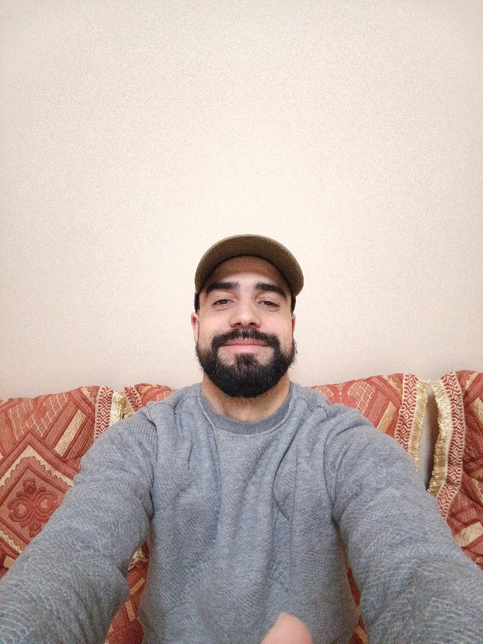 A man wearing a gray sweatshirt and a tan baseball cap sits on an orange and red patterned couch. He has a dark beard and appears to be smiling slightly. The background is a plain, light-colored wall. The photo is taken at a close range, capturing him from the chest up. His arms are visible, stretched out towards the camera.