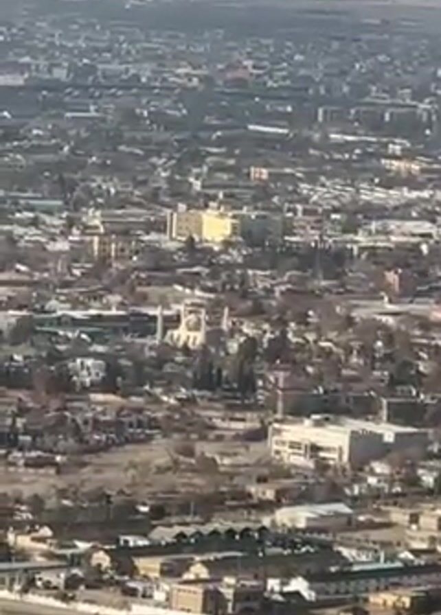 The video displays a wide aerial view of a densely populated city landscape under a slightly hazy sky