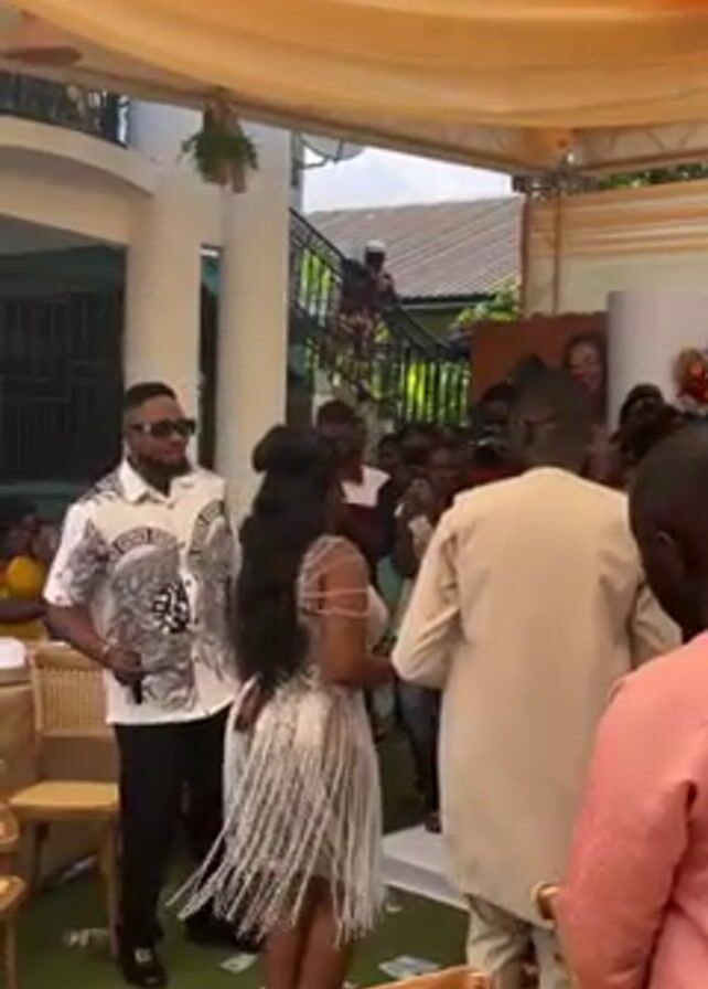 Under a tented area decorated with light orange draping, a woman in a sparkly fringed dress dances as people throw money at her. She takes a few bills from one woman in a yellow dress, while other people standing around take pictures with their phones. Some people sit at tables on the periphery. The ground is covered with money.