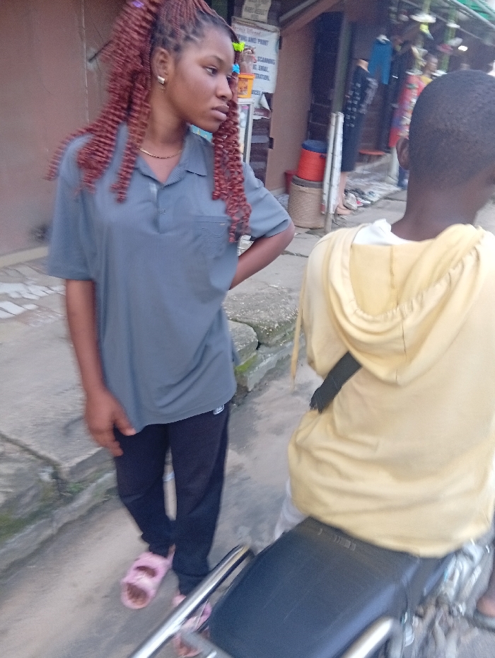 An outdoor scene in Umuode, Nigeria, features two individuals near a commercial building. In the left foreground, a young adult female with light brown skin stands, her body angled slightly towards the right. She has long, reddish-brown dreadlocks or braided hair, partially styled with multi-colored hair ties (purple, yellow, blue, green). She wears a gold-colored chain necklace, a small gold-colored earring in her right ear, a grey short-sleeved polo shirt with a left chest pocket, black athletic-style trousers, and pink slide sandals. Her right hand rests on her hip, and she looks towards the right with a neutral expression. To her right and slightly closer to the viewer, a male figure is seated on a black motorcycle seat, with chrome grab rails visible in the immediate foreground. The male, seen from the back, wears a light yellow hooded sweatshirt and patterned shorts or trousers. A black strap, possibly from a bag, is visible across his upper back. The ground is an uneven concrete or paved surface with some visible discoloration and minor debris. In the background, a light brown commercial building serves as a backdrop. A partial white sign with black lettering is affixed to the building, displaying text such as "COPYING AND PRINT," "SCANNING," and "EMAIL." Near the building, a red plastic container, a blue plastic container, and a wicker basket are visible. Hanging items resembling clothing or other merchandise are also discernible further into the background, suggesting a retail or service establishment. The scene is illuminated by natural daylight.