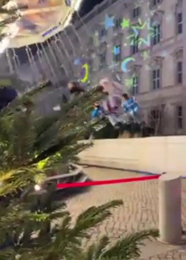 rotating chair swing ride operating at night. The ride has multiple chairs hanging from chains and rotating around a central structure. People are riding in the chairs. The ground is paved with light-colored stone blocks, and there is a small Christmas tree with lights in the foreground. A red rope separates the ride from the public area. A building with windows is visible in the background, illuminated with projected images of stars and crescent moons. The overall setting is festive and appears to be a Christmas market or holiday celebration.