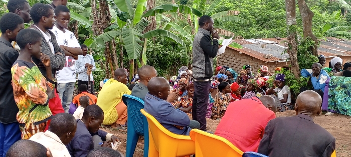 The image portrays an outdoor community gathering in Namisha, Democratic Republic of the Congo. Approximately 50 to 70 individuals, largely adults, are assembled on reddish-brown earth. A man, positioned centrally, wears a grey and black zippered jacket over dark trousers, holding a silver-colored microphone to his mouth with his right hand and white papers in his left, actively addressing the assembly. To the speaker's immediate left, several men are seated on brightly colored plastic chairs, specifically yellow and blue. One man in a blue suit jacket is seated on a yellow chair, facing towards the speaker. Further left, a group of young men stand, observing, some wearing casual attire like a multi-colored patterned shirt or a white t-shirt with a graphic. In the background left, another man stands holding a string instrument resembling a guitar. To the speaker's right, a large contingent of individuals, predominantly women, are seated directly on the ground. Many are dressed in colorful, patterned fabrics and wear head coverings, all facing towards the central speaker. In the mid-background on the right, several single-story structures with reddish-brown brick walls and corrugated metal roofs are visible. The entire scene is set against a backdrop of dense, lush green tropical vegetation, including large banana plants and various trees.