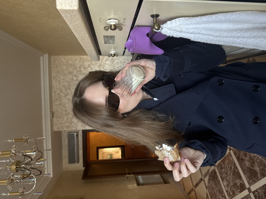 A female subject is depicted within a residential interior, appearing to be a kitchen or a room with kitchen amenities. The individual has brown hair, wears dark tortoiseshell sunglasses, and is dressed in a dark blue double-breasted coat. She is drinking a light-colored liquid from a clear, ribbed glass held in her right hand, while concurrently holding a piece of bread or pastry topped with a white substance in her left hand. The environment includes a light-beige wall with a textured pattern and brown and beige geometric patterned tile flooring. To the subject's right, a light-colored built-in oven featuring brass-toned control knobs and a digital display is visible beneath a beige countertop. A purple silicone oven mitt and a white hand towel are suspended from a brass handle on the oven. In the background, an open doorway leads to another room. A white radiator is affixed to the wall adjacent to the doorway, beneath a white wall-mounted split-system air conditioning unit. An ornate multi-tiered chandelier with clear crystalline elements is suspended from the ceiling. The specific location within the city of Khimki, Russia, cannot be determined from the visual evidence presented in the image.