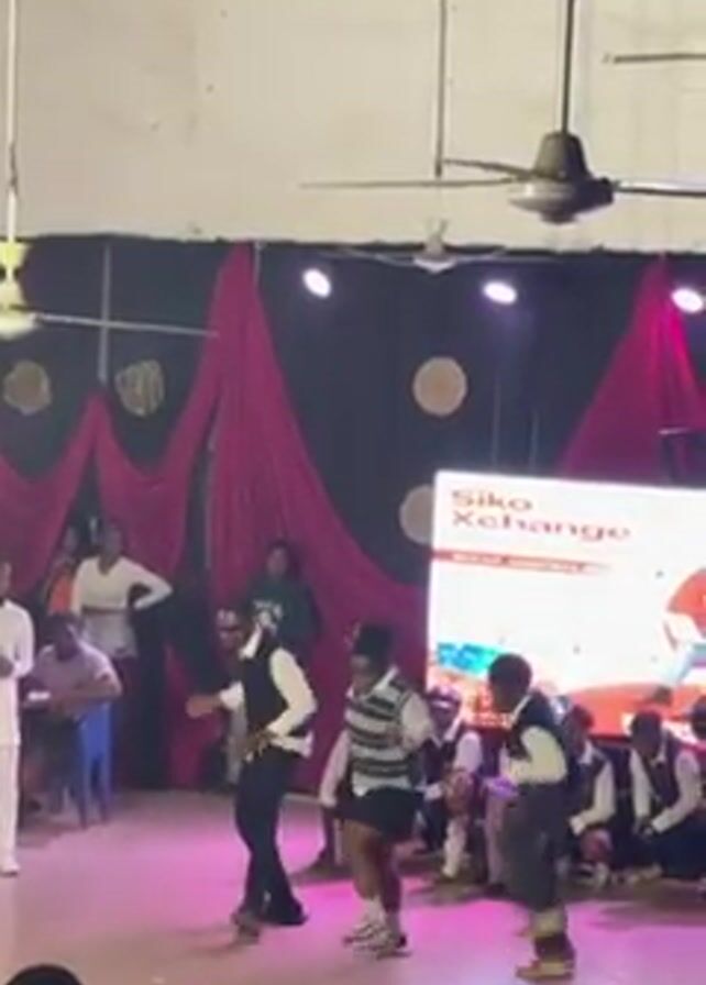 three dancers, two male and one female, performing on a stage indoors. They are wearing casual clothing and dance in unison to an energetic, rhythmic beat. A screen behind them displays "Siko Xchange." A seated audience observes, and several people stand to the side. The stage is decorated with pink draping. Ceiling fans are visible above. The setting appears to be a school event or talent show.