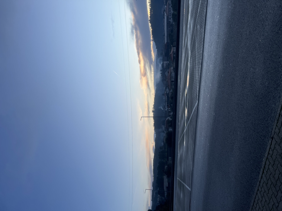 An angled outdoor shot depicts a parking lot meeting a distant town