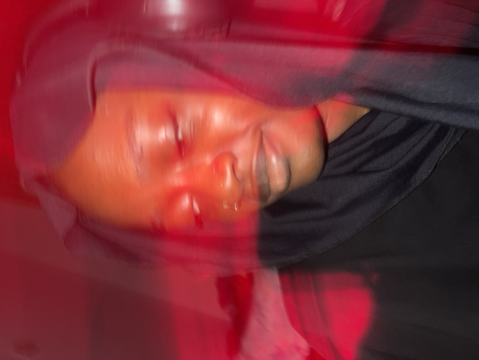 A person with brown skin is wearing a black hooded garment. The face is slightly blurred, revealing closed eyes, a nose, and a partially visible mouth with teeth. The photograph appears to have a red filter or light overlay. The image is oriented with the person's head tilted to the side.