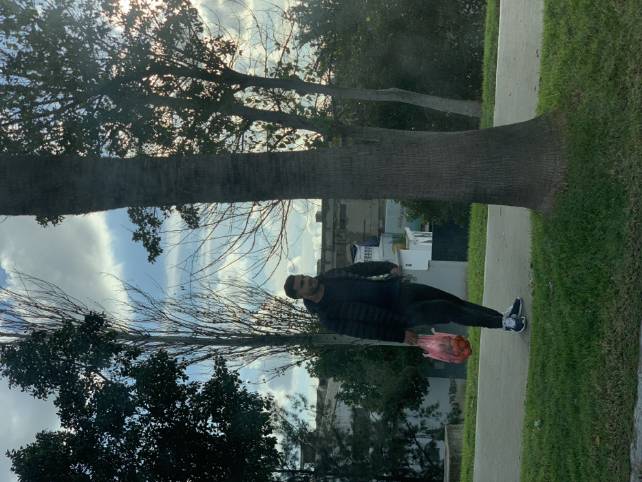 An adult male walks on a paved pathway, moving from left to right, in an urban environment in Tangier, Morocco, under a partly cloudy sky. He is dressed in a black puffer jacket, dark shirt, dark trousers, and dark athletic shoes with white soles. He carries a translucent red plastic bag containing several round orange fruits in his left hand. A large, dark tree trunk occupies the right foreground, while green grass borders the pathway and foreground. Various trees with different foliage densities are visible in the mid-ground and background. In the background, urban structures include concrete walls, white buildings, and a partial "AirFrance" sign on a white structure, indicating a commercial or residential area with green spaces.