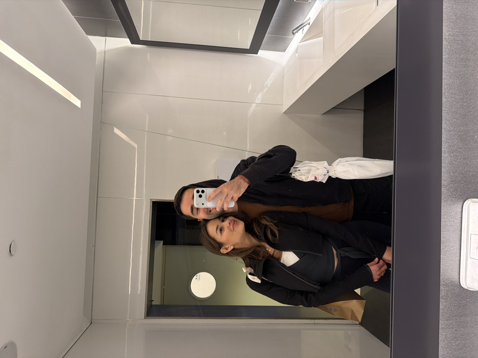 A mirror selfie captures two individuals, one male and one female, inside a modern public restroom in the city of Al Jizah, Jordan