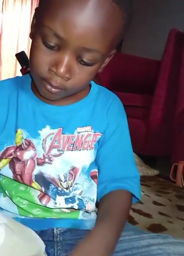 A young, dark-skinned boy wearing a blue, short-sleeved Marvel's Avengers T-shirt and jeans is sitting down and focused on something in his hands. He appears to be indoors, possibly at home, with a red chair and other items visible in the background.