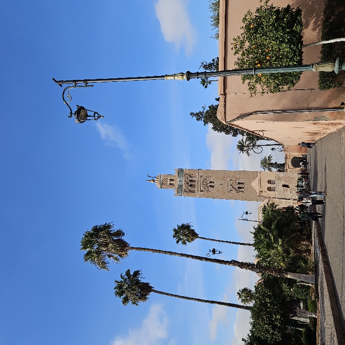 The Koutoubia Mosque in Marrakesh stands tall under a blue sky with scattered clouds. Palm trees line the avenue leading toward the mosque. A vintage street lamp with ornate details is on the left, and a peach-colored wall with an orange tree borders the right side of the road. People stroll along the avenue, adding life to the scene.
