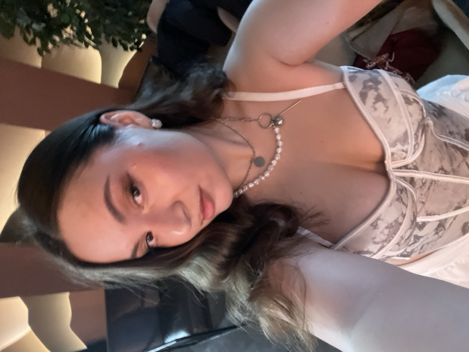 A young adult female is depicted in a selfie-style photograph taken indoors, within what appears to be an upscale restaurant, lounge, or bar in Moscow, Russia. She has long, wavy dark brown hair parted on the left side (viewer's right) and wears a light-colored, possibly white or light grey, bustier-style top with a subtle marbled pattern. Her right ear (viewer's left) displays a small, light-colored stud earring. Two necklaces are visible: a thin silver chain with a circular pendant, and a second necklace featuring a string of pearls on one side and a silver chain with a prominent ring and a smaller, heart-shaped or key-shaped charm on the other. She is looking directly at the camera with a neutral expression, and her face is made up with defined eyebrows and warm-toned eyeshadow. The background features distinctive warm-toned, possibly wooden, wall panels that are sculpted into undulating or wave-like patterns, illuminated by soft, recessed lighting. To the left, dark, plush seating is partially visible, while a blurred green plant is present on the far right. The scene is characterized by dim, warm ambient lighting, creating a sophisticated atmosphere.