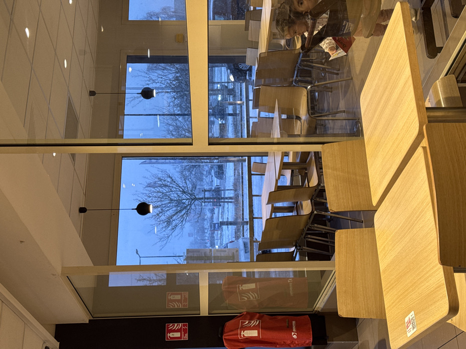 - "The image depicts the interior of a dining establishment, possibly a fast-food restaurant or cafeteria, in Lys-lez-Lannoy, France, during what appears to be a snowy or frosty day, indicated by the blue ambient light and white ground visible through large glass windows" by FM-xTDQG2, licensed under CC BY 4.0