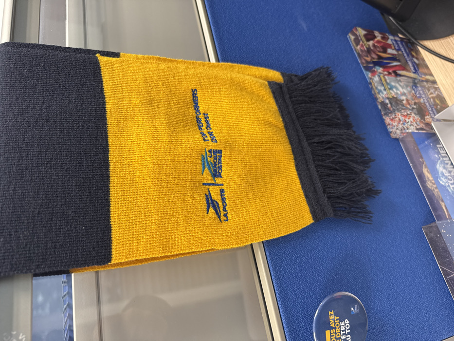 This image captures a close-up view of a promotional scarf and related items within a La Poste or La Banque Postale branch in Caen, France