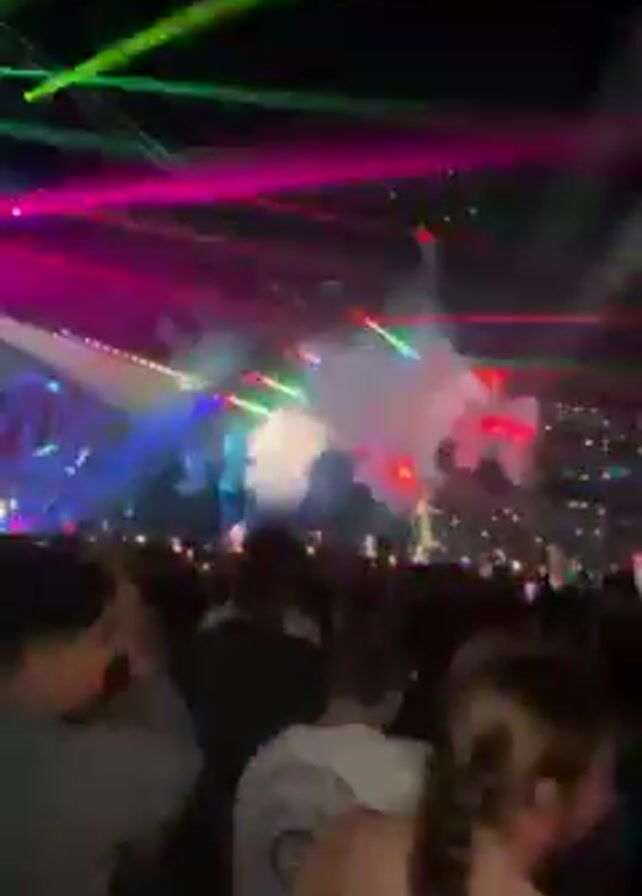 crowd of people at an indoor concert, with bright, colorful lights illuminating the stage and the audience. Several bursts of smoke are visible near the stage. The crowd is generally facing the stage and appears to be enjoying the performance, with some people holding up phones or arms. The lighting includes pink, green, blue, and white beams, and there is a large screen behind the stage displaying images.