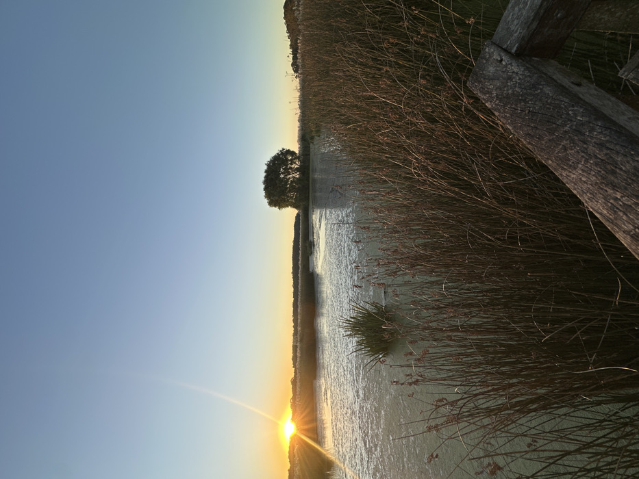 Sunset over a waterway reflects a brilliant orange sun. Tall reeds line the edge, bordering still, light-colored water. A solitary tree stands on the horizon. A weathered wooden structure is in the foreground. The sky shifts from blue to a soft orange glow. The entire scene is captured in a slightly rotated portrait.