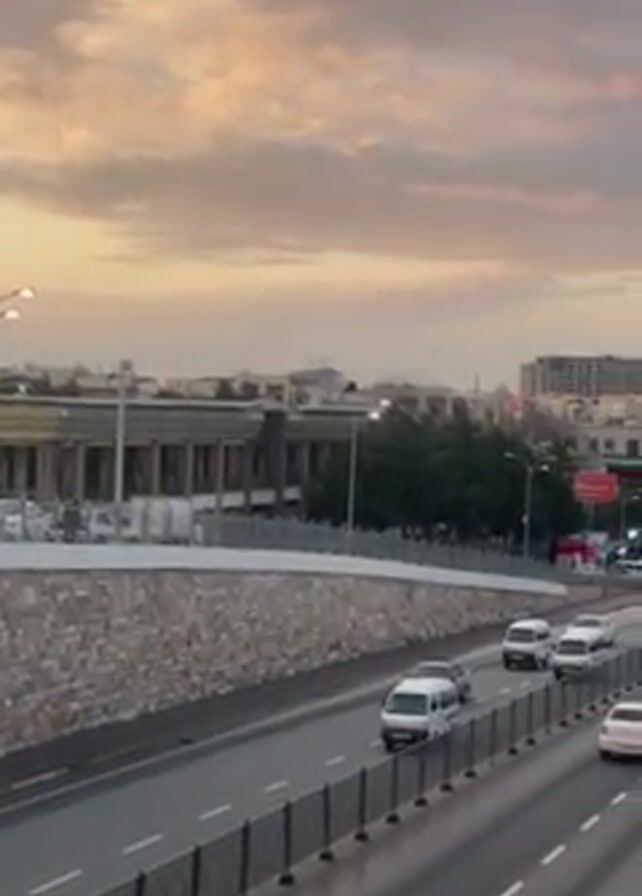 view of a highway in a city. The camera pans slightly, revealing a wide, multi-lane road with cars, vans, and trucks driving on it. On either side of the road are stone walls and sidewalks with streetlights. In the background are buildings, trees, and a sky with pale clouds tinted with orange and pink from the sunset. The scene has a quiet, urban feel.