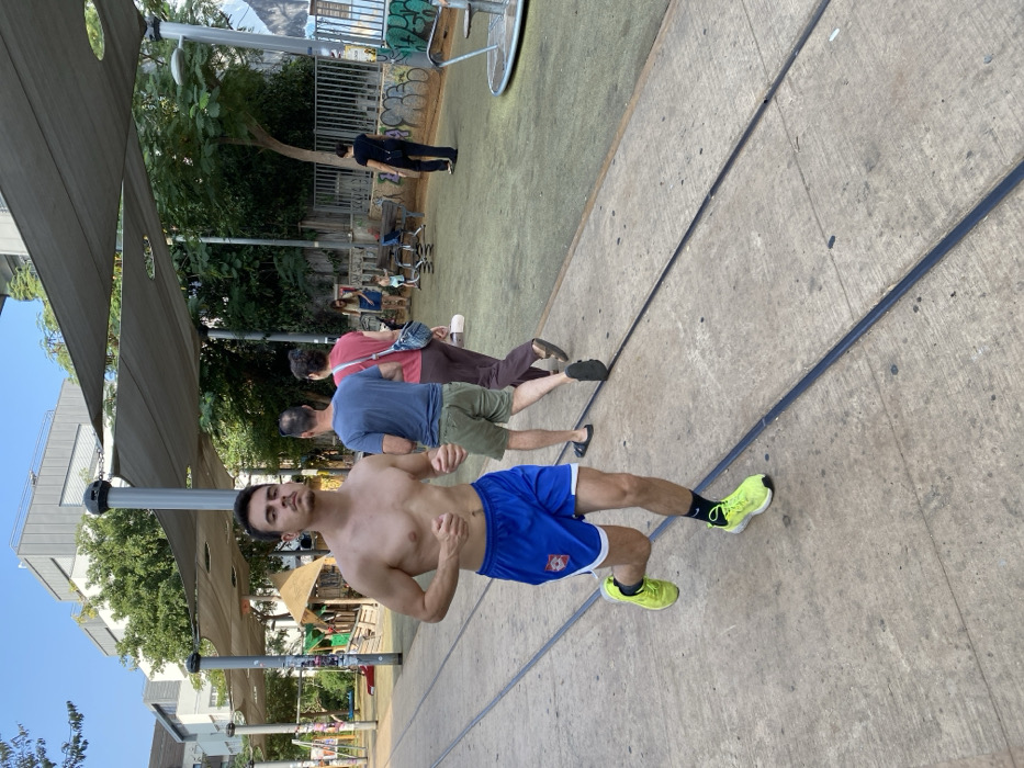 A shirtless man in blue shorts and neon yellow sneakers appears to be running along a concrete walkway. Behind him, two more men, fully clothed, are also running. The scene is set in a park with trees and playground equipment visible in the background. Overhead, a canopy provides shade. A person stands at the end of the path on a grassy area.