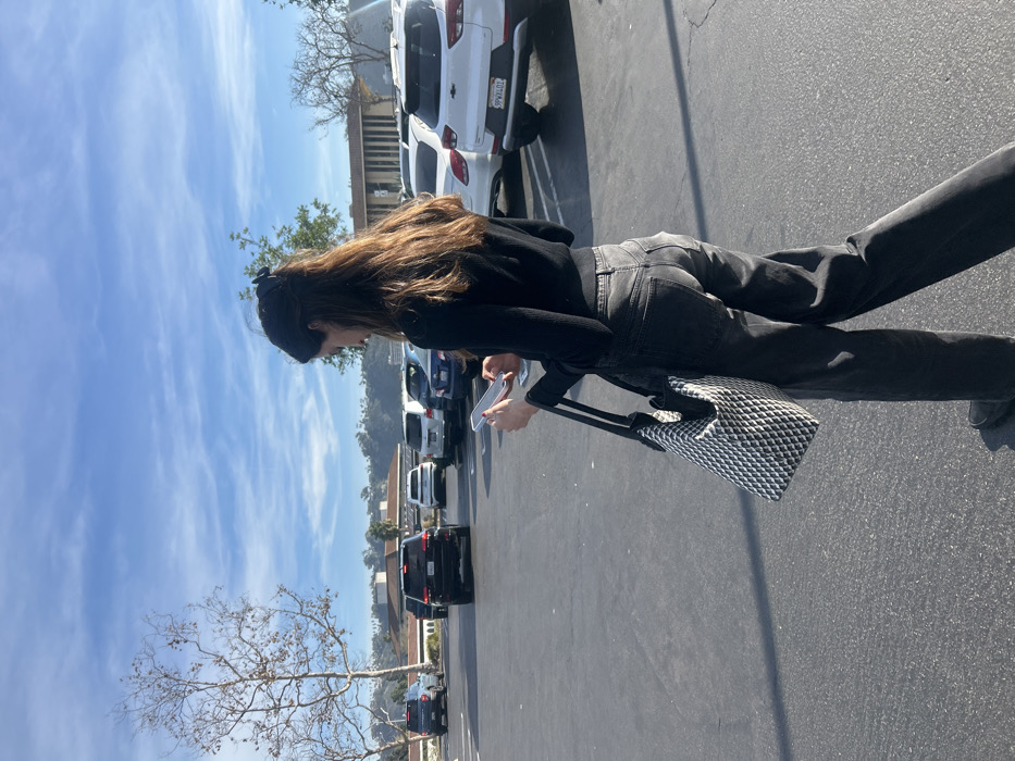 A woman stands in a parking lot, facing left, holding a phone. She wears a black sweater, dark gray jeans, and a black hair clip. Her hair is long and brown. A patterned tote bag rests near her. Cars are parked along a building in the background. A bare tree branch is on the left, against a blue sky with scattered clouds.