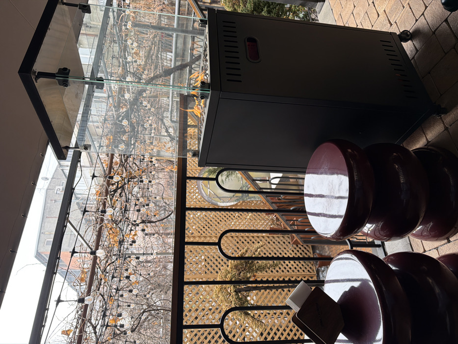 This image depicts an outdoor patio or balcony area, likely belonging to a cafe or restaurant, located in Yerevan, Armenia. The scene is observed from a slightly elevated perspective, looking outwards. In the right foreground, a tall, matte black rectangular outdoor gas patio heater is prominent. It features a clear glass enclosure at the top, inside which active, orange flames are visible, fueled by what appears to be decorative fire glass or lava rocks. The heater has vertical ventilation slits and a red-accented handle on one side, and it rests on small wheels. To the left, two glossy, dark maroon stools are arranged. Each stool is composed of multiple stacked, rounded, disc-like segments. A dark wooden napkin holder, containing white paper napkins, rests on the top surface of the leftmost stool. A black metal railing with decorative curved elements runs horizontally across the midground, separating the immediate patio space from the exterior. Behind this railing, a light-colored wooden lattice screen provides a partial barrier. Beyond the screen and railing, an array of bare tree branches or grapevines, some still holding scattered amber-colored leaves, are visible. Numerous string lights with bare, warm-toned bulbs are strung horizontally across these branches. In the distant background, urban buildings, predominantly light-colored and multi-storied, are discernable through the network of branches and lights. The patio floor is paved with light brown, brick-like pavers arranged in a herringbone pattern. No people are visible in the scene.