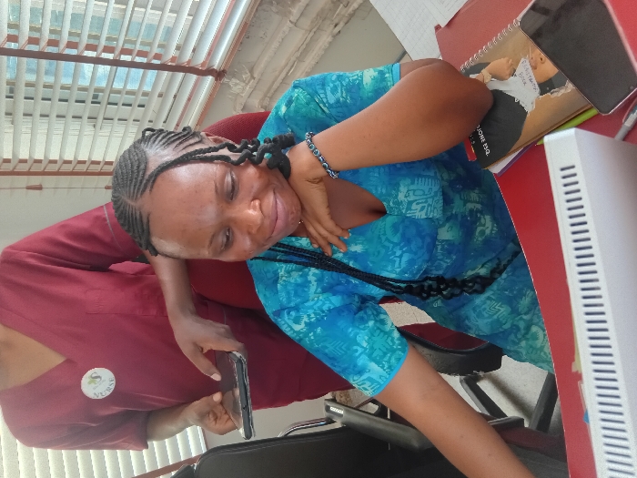 This image depicts two individuals in an indoor office or clinical setting within Lokoja, Nigeria. In the foreground, an adult female with braided hair, including prominent cornrows and spiral curls on the right side, is seated in a black office chair. She wears a short-sleeved blue and light blue patterned V-neck dress and a beaded bracelet on her right wrist. She is looking down and to her left with a soft smile, her right hand supporting her chin. On the red desk in front of her are a white device with vertical ventilation slats, a stack of books (one spiral-bound book displays "CHRISTIAN BOOK" and an image of a child), a dark smartphone, and a silver pen. Behind the seated woman and to her left, a second individual, partially visible from the chest up, stands. This individual wears a maroon V-neck scrub top with a circular white badge on the left side, clearly marked with the word "NURSE." They are holding a dark-colored smartphone horizontally with both hands, positioned at desk level. The background includes white horizontal window blinds and a light-colored wall.