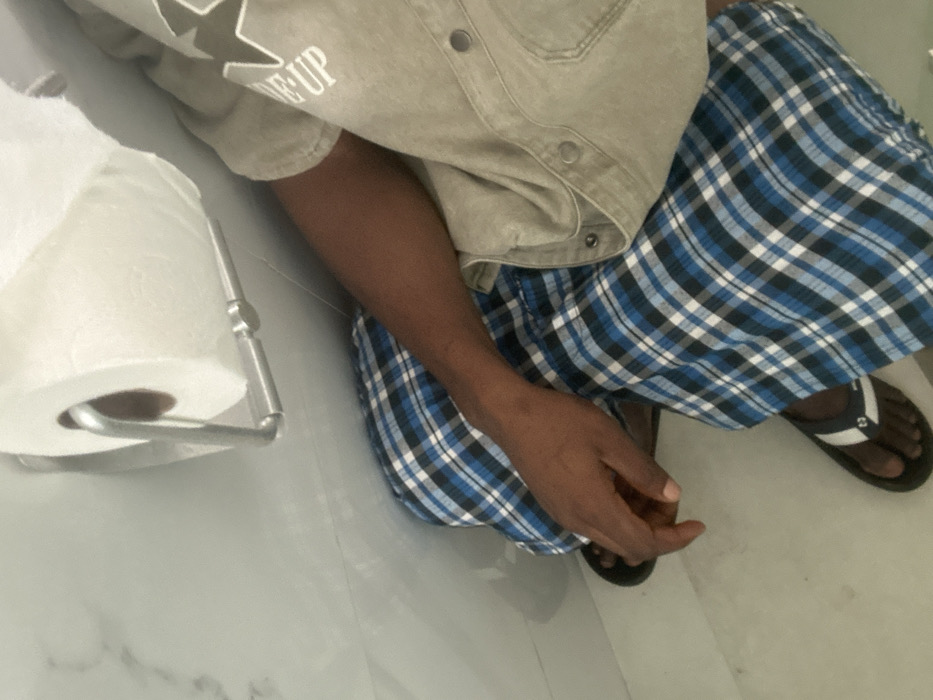 This image, captured in Otampa, Nigeria, presents an individual from a high-angle perspective within what appears to be a tiled bathroom or toilet area