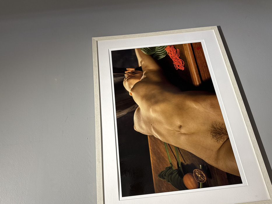 A framed portrait on a gray wall showcases a nude person with tan skin