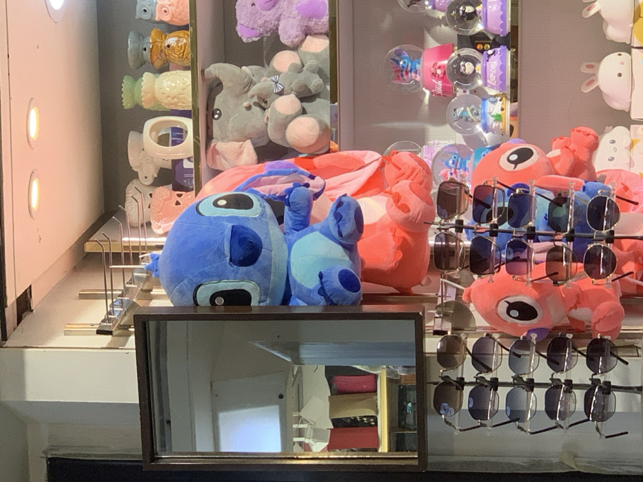 The image depicts the interior of a retail establishment, likely a gift or novelty store, located in Barza Municipality, Syria. The scene is dominated by merchandise displayed on shelves and racks under warm-toned recessed ceiling lights. In the upper-center, a large blue plush toy resembling Disney's Stitch is prominently displayed, partially obscured by a dark-framed rectangular mirror on the left. Below it, several large pink/red plush toys, resembling Stitch's counterpart Angel, are visible. To the right, on a middle shelf, a grey plush elephant holding a smaller grey plush elephant is visible next to a purple plush teddy bear. Above these, on a higher shelf, various ceramic or glass decorative items, including a white pineapple-shaped piece, an owl, and other abstract forms, are arranged. Below the large plush toys, a collection of smaller snow globes featuring animated characters, including Stitch, are lined up on a lower shelf or counter. To the far right, several small, white, rabbit-shaped objects are also displayed. In the foreground, two vertical, freestanding rotating racks filled with sunglasses are visible. Each rack holds multiple pairs of sunglasses with various frame styles and tinted lenses. The mirror on the left reflects an interior space showing what appear to be colorful, rectangular items, possibly bags or textiles, arranged on a surface, along with part of a light-colored wall or structure. No human figures are present.