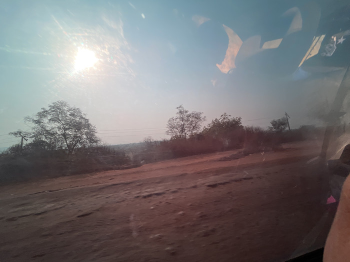 An outdoor scene with a dirt road in the foreground and trees in the background. The sky is bright with the sun. Telephone poles are visible. The image appears to be taken through a window, with reflections visible. The landscape is somewhat arid, with sparse vegetation.