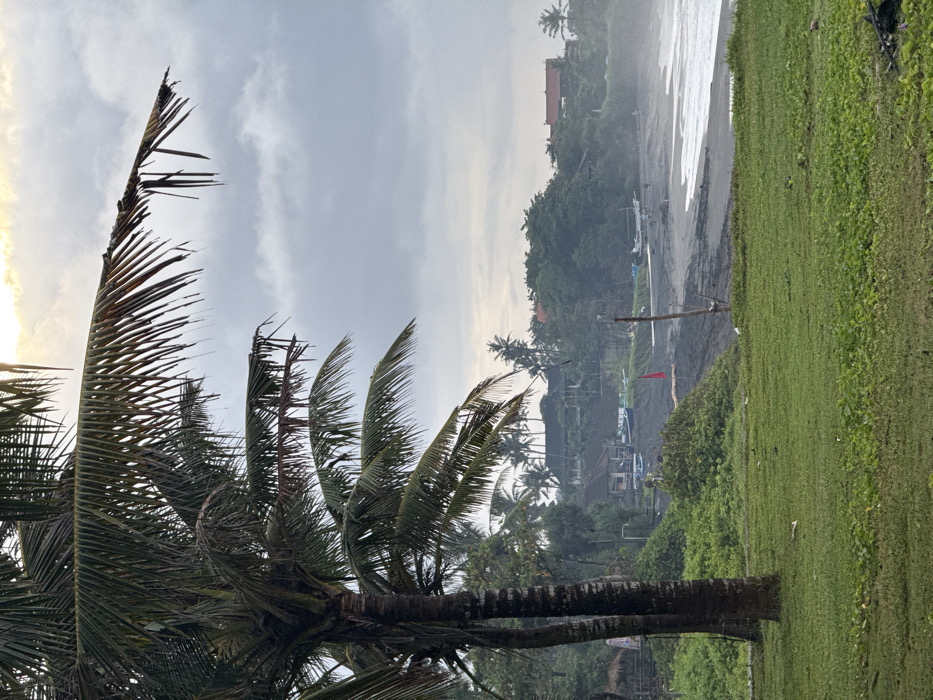 A cloudy day at the beach features a prominent palm tree in the foreground with tattered fronds. The black sand beach is visible with waves breaking. Green foliage covers the right side, sloping down to the beach. Further back, a cluster of buildings and boats is nestled among other palm trees. A red flag stands on the beach. The overall scene is slightly hazy.