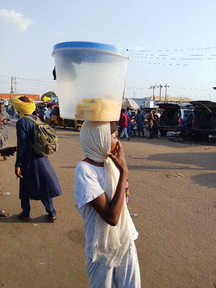 A woman in pajamas and a headscarf balances a large, clear plastic container filled with yellow plantains on her head. She stands on a paved road in a bustling outdoor market. People mill about in the background, and cars are parked nearby. Another person in a long blue robe and yellow head wrap walks to the left, carrying a green backpack. Overhead power lines are visible against a clear sky.