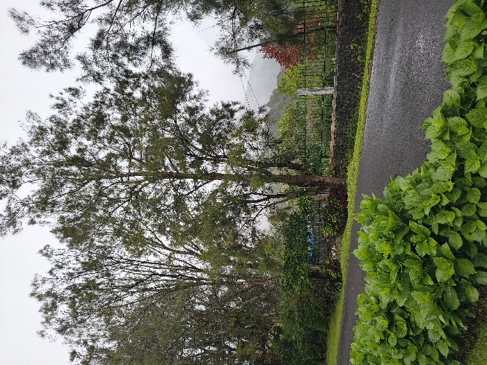 A landscape view features lush greenery and a narrow road. A dense tree dominates the left side, its branches extending towards the overcast sky. A dark, paved road runs along the right, bordered by vibrant green plants. Further back, a fence separates the foreground from a background of hills and trees, the scenery softened by what appears to be mist or light rain.