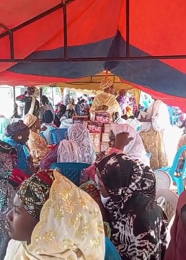 The video depicts a gathering of people under a red and blue tent, possibly at an event. Most of the attendees are women dressed in a variety of traditional headscarves and clothing. Some are seated and eating from plates, while others are engaged in conversation. In the background, a person wearing a golden headpiece or crown is seated on a raised platform, surrounded by what appears to be gifts or stacked boxes. The atmosphere seems lively, with background music and general activity. The camera remains relatively still, focusing on the crowd and the central figure on the platform.