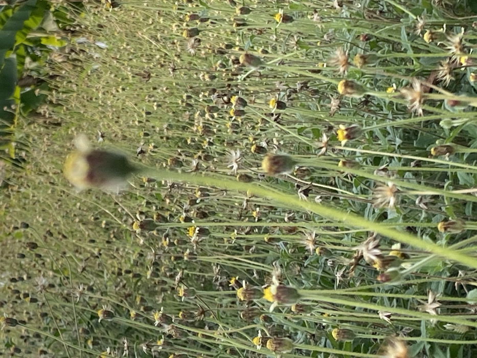 The image displays a dense field of vegetation located in Amancho, Nigeria. The foreground features a single, slender green plant stem in sharp focus, topped by a yellowish-brown, developing flower head. Surrounding and extending into the blurred background is a proliferation of similar small flowering plants, characterized by numerous thin green stems, small yellow disk flowers, and brownish-green seed heads, consistent with common wild herbaceous species. The overall environment appears natural and overgrown, with no human figures, artificial objects, or explicit actions visible within the frame. A hint of larger, darker green foliage is present in the upper right background.