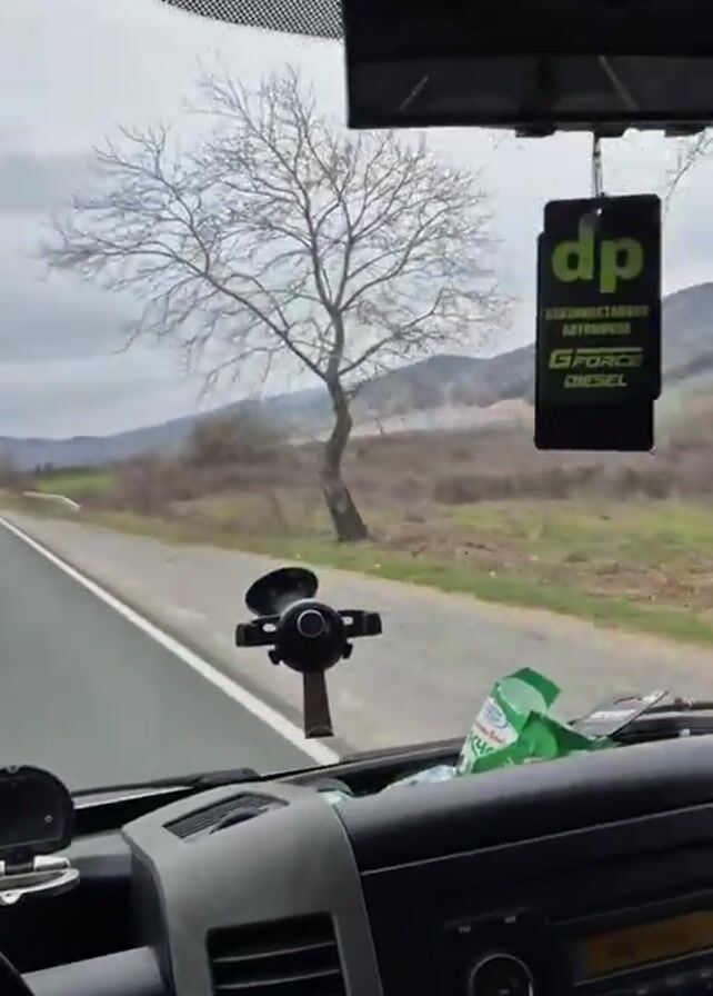dashboard-level perspective of a person driving on an asphalt road in what appears to be a rural area. The sky is overcast. The road ahead is mostly straight, with a distant truck visible in the oncoming lane. Two bare trees stand on the right side of the road, and fields and distant mountains are visible in the background. The dashboard contains a steering wheel, a car mount for a cell phone, vents, and a car radio. A "dp" branded air freshener hangs from the rearview mirror. A box of tissues rests on the dashboard. The camera view is focused on the driver's perspective of the road and surrounding scenery.