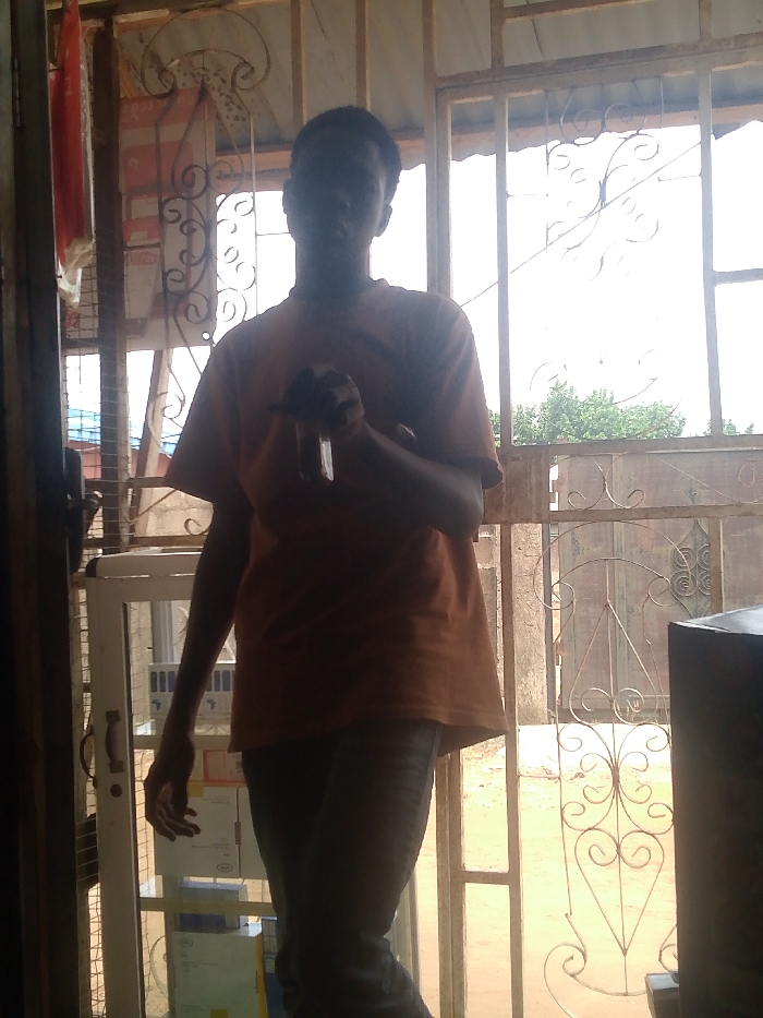 The image captures a dark-skinned adult individual standing centrally, mostly silhouetted, indoors in Agege, Nigeria