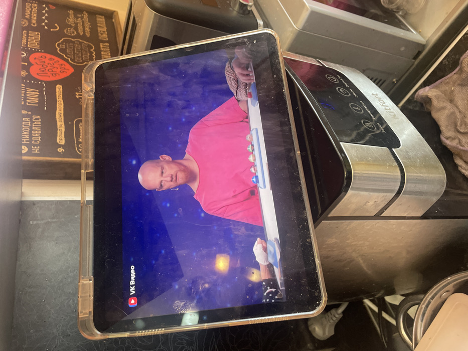 An image taken in a kitchen in Tolyatti, Russia, shows a tablet resting on a "Kitfort" brand electric kettle or water dispenser. The tablet, housed in a clear protective case, displays a video from "VK Видео." The video features a bald, fair-skinned man with stubble, wearing a bright pink t-shirt, looking towards the viewer's right with a serious expression. He is seated at a white table equipped with several colored buttons (red, blue, green, orange, silver). A hand, gloved in white, is visible on the left side of the table, interacting with cards or a flat object. Another hand is visible on the right, resting near a red button. The video background is dark blue with diffuse white lights. The "Kitfort" appliance, model KT-6112, has a black and silver finish with a digital display and touch controls labeled "Замок" (Lock), "Температура" (Temperature), "Объем" (Volume), and "Старт/Стоп" (Start/Stop). Behind the tablet, a dark surface, possibly a chalkboard, is covered with Russian text in a white chalk-like font, including phrases such as "НИКОГДА НЕ СДАВАТЬСЯ" (NEVER GIVE UP), "ГОВОРИТЬ ПРАВДУ" (TO SPEAK THE TRUTH), and "ЛЮБИТЬ ДРУДА Я ВРУ" (TO LOVE A FRIEND I LIE) next to a red heart. A numerical list is also visible, with "9. ПРОЩАТЬ, ДОМА КОГДА ТРУДНО" (9. FORGIVE, WHEN IT'S HARD AT HOME) and "10. МЕЧТАТЬ" (10. TO DREAM). To the right of the Kitfort appliance, a portion of a metallic toaster or microwave is visible. To the bottom left, an electrical plug and part of a metal pot are present, along with a beige cloth on the counter surface. Dust and smudges are visible on the tablet screen and appliance surfaces.