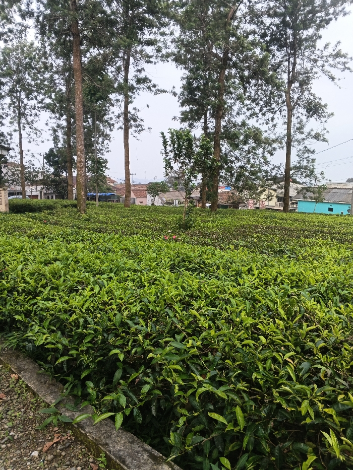 The scene depicts an outdoor landscape in São Félix do Xingu, Brazil, under an overcast sky. A concrete curb runs horizontally across the bottom left, bordering a gravel path. Immediately behind the curb, and extending through the midground, is a vast, dense field of low-growing, vibrant green plants, consistent with a cultivated tea plantation. Several tall, slender trees with light brown trunks and green foliage stand vertically throughout the field and midground. In the background, a cluster of low-rise buildings with varied facades, including white, light pink, light yellow, and a prominent turquoise structure on the right, is visible amongst additional trees and vegetation. No individuals or animals are present.