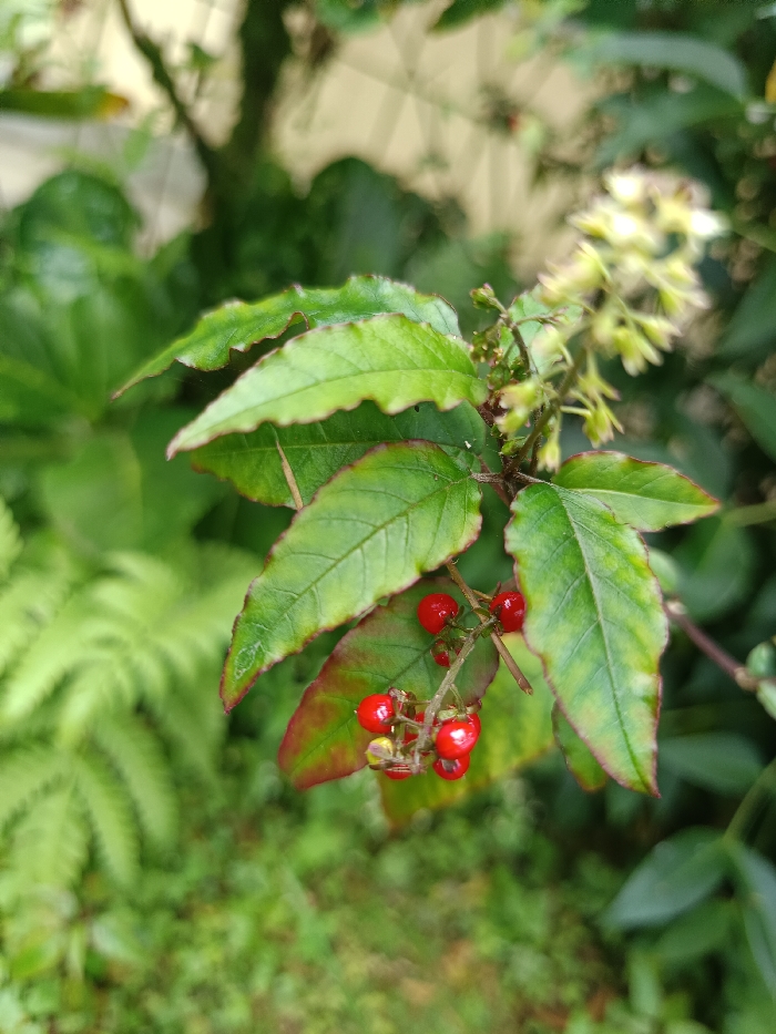 A close-up image depicts a plant branch with multiple green leaves and clusters of small, spherical, bright red berries, approximately 5-8 mm in diameter, hanging beneath the foliage. The leaves are ovate with serrated margins and visible venation, some displaying reddish-brown coloration at their edges. Above the berries, a section of the branch exhibits light green to yellowish, elongated flower buds or undeveloped fruit structures. The background is significantly blurred, featuring various green plant elements, including a discernible fern frond on the lower left. In the upper background, an out-of-focus, light-colored object with faint polygonal patterns suggests a structure or barrier. The scene is outdoors under natural lighting. No human subjects or discernible activity are present. The location is Gunung Putri, Indonesia.