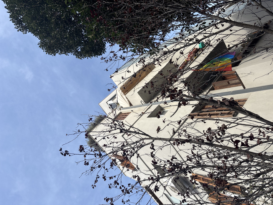 An upward-angled photograph depicts a multi-story, light-colored residential building in Tel-Aviv, Israel, set against a clear blue sky with sparse, wispy clouds. The structure features angular facades, multiple rectangular windows, and several balconies. Many windows are equipped with open, dark brown wooden shutters. A rainbow-striped pride flag hangs vertically from a mid-level balcony on the building's right side, extending downwards from the railing. Directly above this, a light-colored, possibly white, fabric awning extends from another balcony. In the foreground, multiple deciduous trees with slender, dark-branched limbs and sparse, dark reddish-brown leaves partially obscure the building. To the far right, a dense evergreen tree with dark green foliage is visible. No individuals or discernible actions are present in the scene.