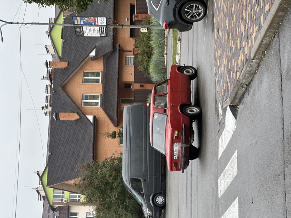 The image displays a street scene in Sofiivska Borshchahivka, Ukraine, under an overcast sky. A red, older model sedan, bearing Ukrainian license plate `A 3038 ЧК`, is centrally positioned, oriented towards the right side of the frame but moving left, with visible exhaust vapor emanating from its rear. The vehicle's paint shows signs of wear. To the left, a dark grey commercial van, resembling a Mercedes-Benz Sprinter, is parked parallel to the street, facing right. On the far right, a portion of the rear of a black SUV is visible, parked perpendicular to the street. The foreground consists of a wet asphalt road with white pedestrian crossing markings. A sidewalk constructed of patterned brown, beige, and orange paver tiles runs along the right edge of the road, separated by a concrete curb. In the background, a residential area is visible, characterized by multiple buildings. The most prominent structure is a two-story house with light brown brick walls and a dark grey pitched roof featuring two tall brick chimneys. Adjacent to it on the left, partial views of other buildings are discernible, including one with a distinct light green upper facade. Green foliage, including trees with red berries, and landscaped shrubs are present along the properties. A tall street light pole stands on the right, displaying a vertical advertising banner with text and graphics, including "60е" and "КОНЦЕРТ". Overhead utility lines crisscross the grey sky. No individuals are visible in the scene.