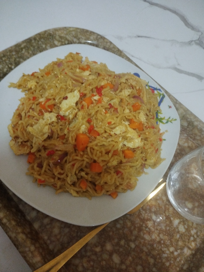A plate of noodle stir-fry is displayed on a square white plate. The noodles are golden-brown and interspersed with diced carrots, red peppers, and what appear to be pieces of scrambled egg. The dish is presented on a marbled tray, with a clear glass object visible to the right. The backdrop includes a mix of marble and textured surfaces.